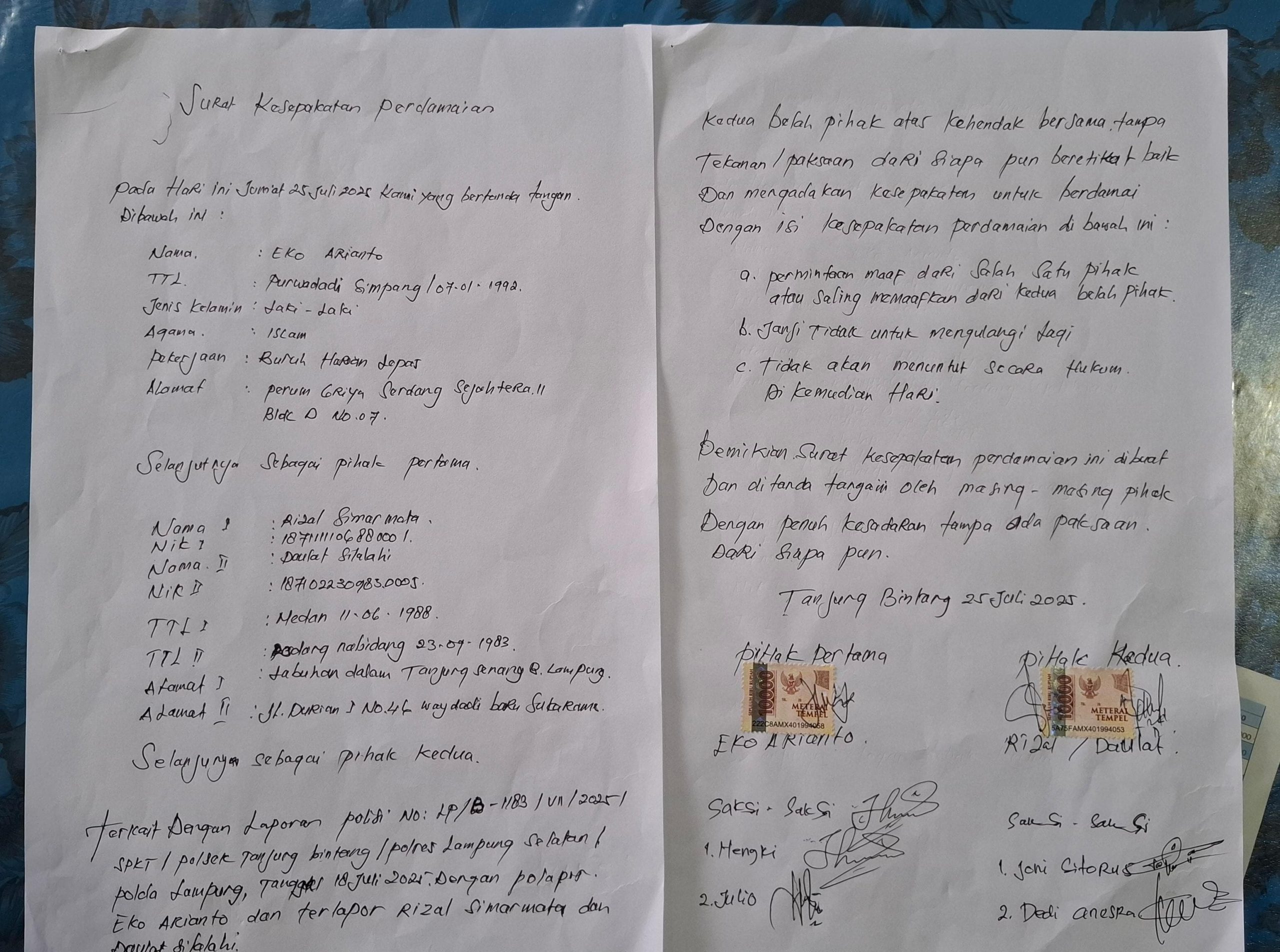 Berakhirnya Berdamai secara tertulis yang di sepakati bersama oleh ke dua belah pihak tersebut lantaran di picu kesalahpahaman adapun Berlangsungnya perjanjian berdamai tersebut, di kediaman nasabah beralamat di Serdang, Kacamatan Tanjung bintang pada Jumat (25/07/2025) dan di saksikan oleh sejumlah saksi serta di Tandatangani, dengan beberapa point kesepakatan Berdamai sebagai berikut :