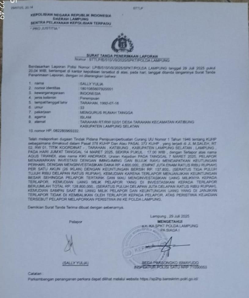 Terkait dugaan tipu gelap melalui aplikasi NEXT15Apjob oleh individu oknum anggota polisi berinisial Ki yang bertugas di wilayah hukum Kapolres Lampung selatan, Sally Yulia dengan resmi melaporkan ke SPKT dan Propam Mapolda lampung berdasarkan surat nomor:LP/B/510/VIII/2025/SPKT/Polda Lampung.