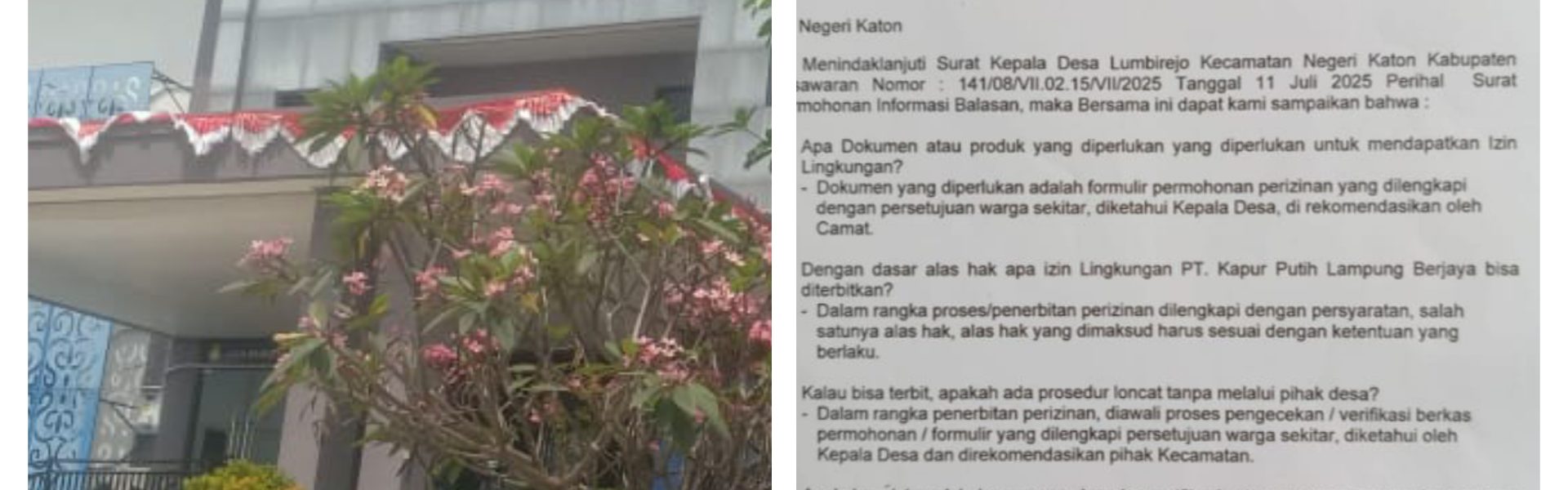 Selain itu, Kepala Desa Lumbirejo, Kecamatan Negeri Katon, juga memberikan klarifikasi bahwa lokasi PT Kapur Putih Lampung Berjaya bukan berada di wilayah Desa Lumbirejo seperti yang beredar di beberapa dokumen dan informasi publik.