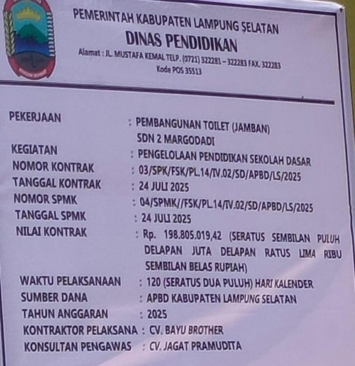 Didalam Banner Informasi yang terpampang tidak ada panjang lebar pembangunan diduga menandakan tidak adanya transparan, yang ada cuman banner nilai anggaran sebesar Rp. Rp.198.805.019.42,- (Seratus Sembilan Puluh Delapan Juta Delapan Ratus Lima Ribu Sembilan Belas Rupiah) Proyek milik Dinas Pendidikan Kabupaten Lampung Selatan.