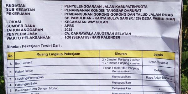 Lampung Selatan–PT Cakrawala Anugrah Selatan melalui pihak Dinas PUPR Kabupaten Lampung Selatan menyampaikan surat tanggapan terkait pemberitaan di kupasindonesia.com yang berjudul;Proyek Pembangunan Gorong-gorong dan Talud Ruas Jalan APBD di Way sulan Baru Seumur Jagung di Kerjakan Sudah Banyak Retak dan…