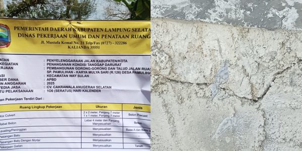 Lampung Selatan,-Proyek pembangunan Gorong-gorong dan Talud Ruas jalan yang terletak di Desa Pemulihan, Kecamatan Waysulan Kabupaten Lampung Selatan banyak retak Diduga tak sesuai Spesifikasi Teknis (Spektek) serta terindikasi adanya mencari keuntungan oleh sejumlah oknum Pelaksana kegiatan. Diketahui, kegiatan penyelenggaraan jalan…